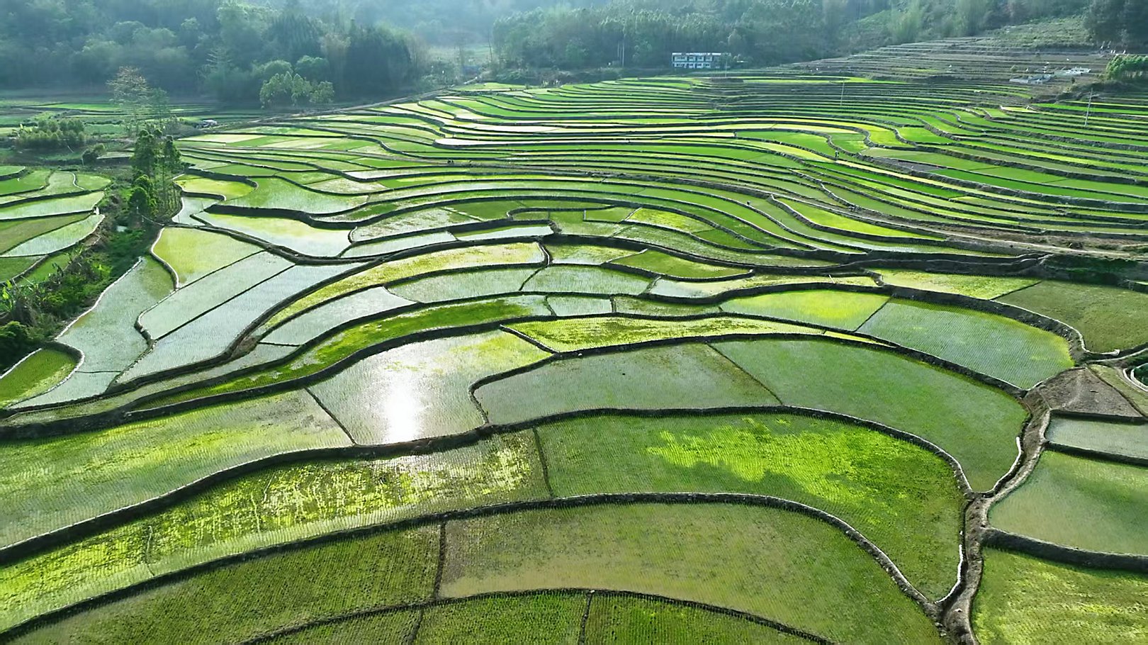 田东县义圩镇朔晚村层层叠叠的梯田错落有致,蓄满盈盈碧水,似一块块绿玉镶嵌在山间,嫩绿的秧苗在微风中轻摇,与光影共舞。(田东县纪委监委 潘光亮/摄)